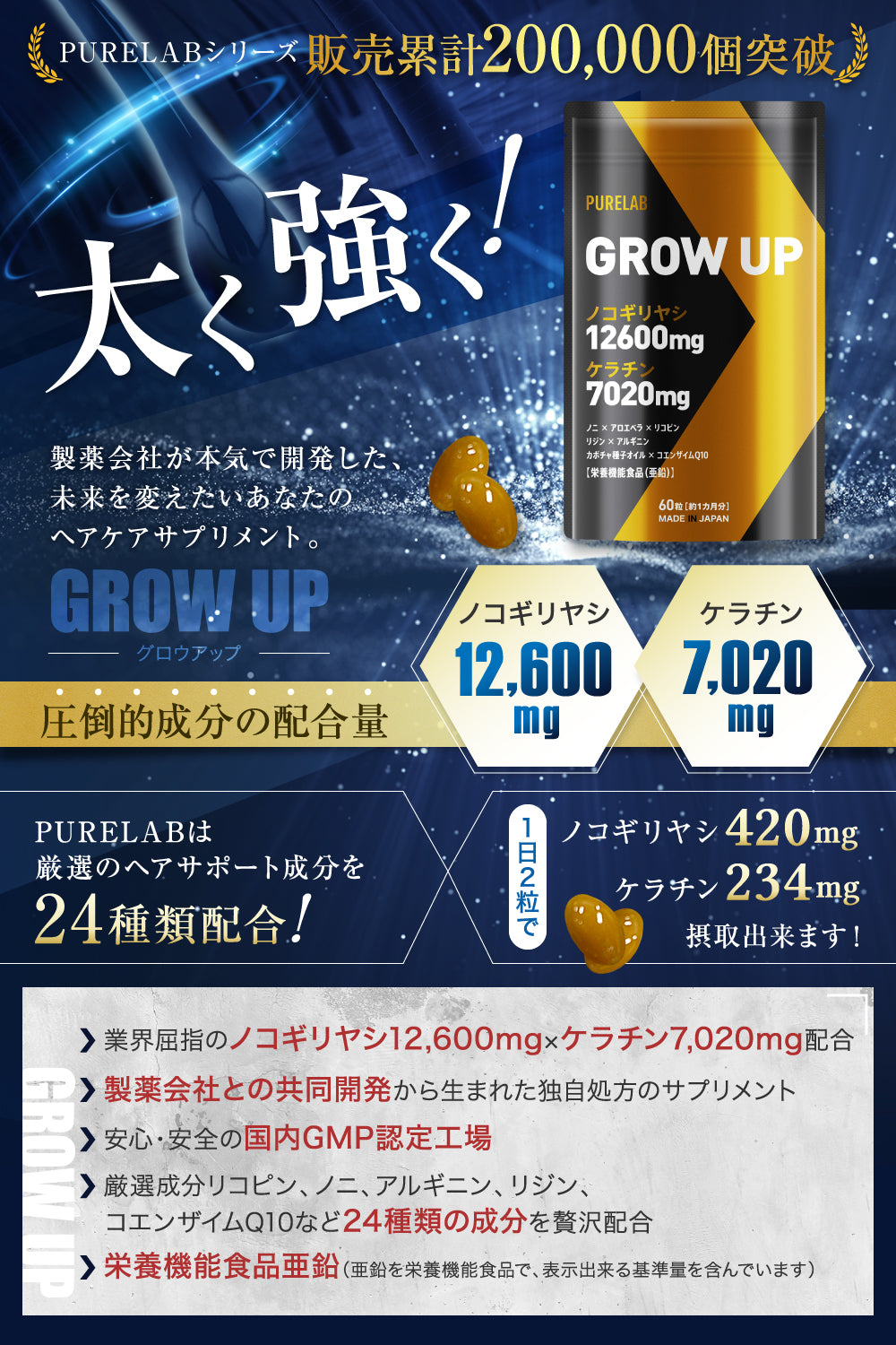 ケラチン加水分解物、ノコギリヤシオイル、ノニ粉末、グルコン酸亜鉛、リコピン、L-アルギニン、L-リジン塩酸塩、ローヤルゼリー、コエンザイムQ10、EPA含有精製魚油加工食品、ビタミンA、ビタミンE含有植物油、ビタミンC、ビタミンB2、ビタミンB6、ビタミンB12、アロエベラエキス、コラーゲンペプチド、大豆ペプチド、イチョウ葉抽出物、カボチャ種子オイル、高麗ニンジン末、金時ショウガ末、食用オリーブ油