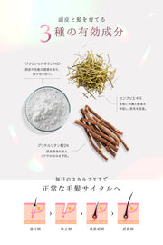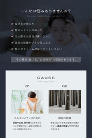 女性の頭皮は乾燥しやすく、妊娠や出産、更年期などのホルモンバランスの乱れに影響を受けやすい傾向があります。女性の頭皮を想った処方で、細くダメージを受けやすい髪を、美しくハリとコシのある髪へと導きます。