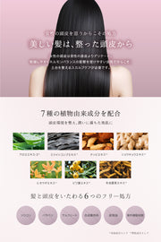 シリコン、パラベン、サルフェート、合成着色料、鉱物油、紫外線吸収剤を無添加。ダメージを抑え、敏感な女性の頭皮をいたわる処方です。
