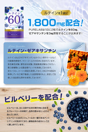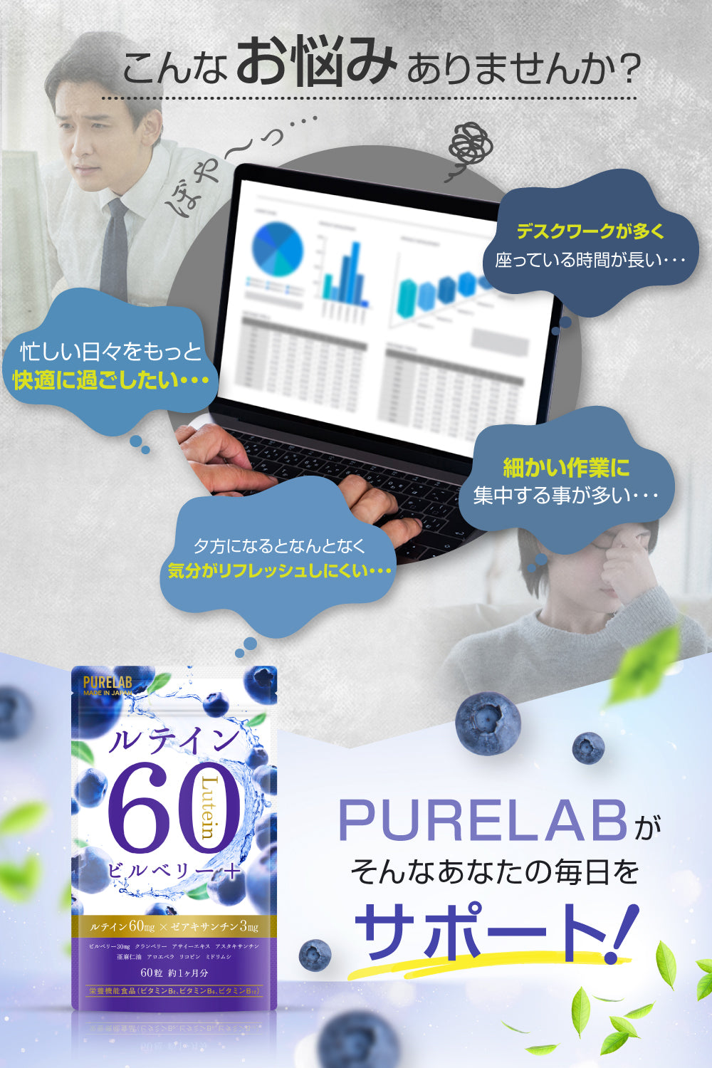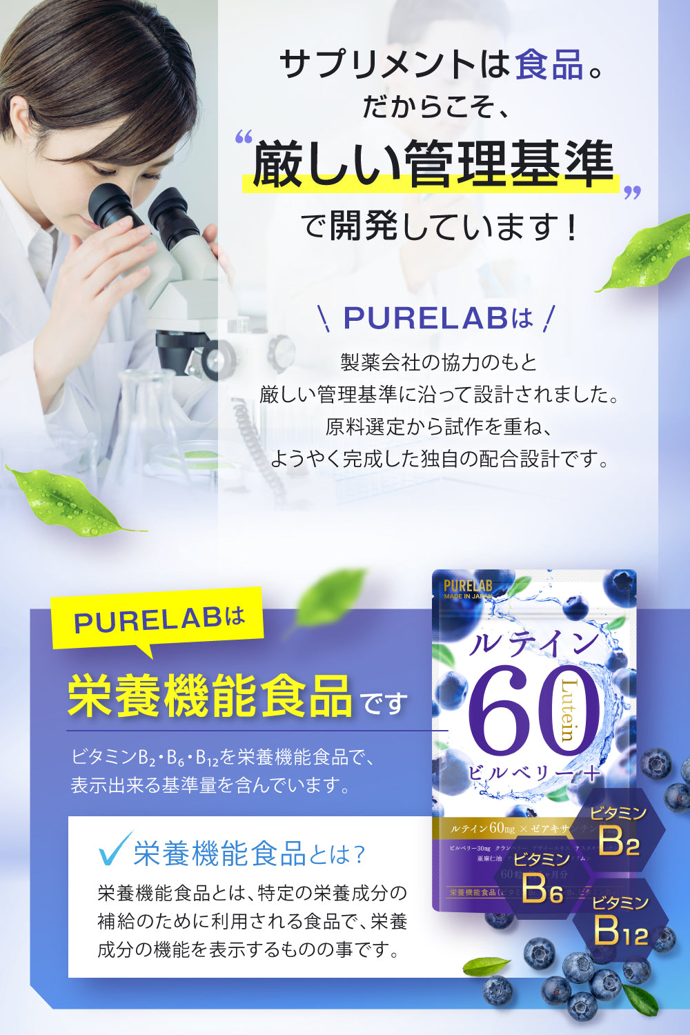 PURELABは、1日2粒あたりルテイン60mgとゼアキサンチン3mgを配合。ルテインには、マリーゴールド由来のフリー体原料を採用しています。