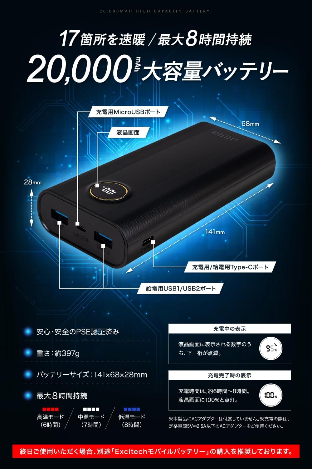 【Excitechヒーターベスト専用/20,000mAh大容量バッテリー】