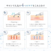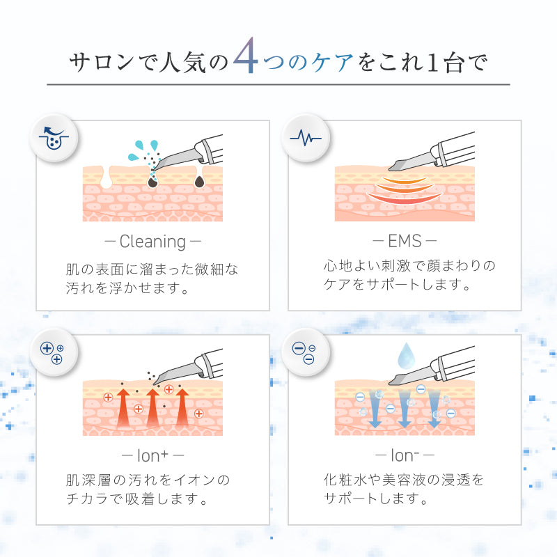 サロンで人気の機能を4つ搭載し、自宅にいながら極上のスキンケアを体験していただけます。水と超音波の振動により毛穴の汚れや古い角質を除去するため肌の負担を最小限にし、優しくケアすることができます。毛穴汚れを取り除くだけでなく、化粧水や美容液の浸透をサポートしツヤのある美肌へ導きます。自動電源オフ機能を備えており、各モードの動作開始時から5分後に電源が自動でオフになります。