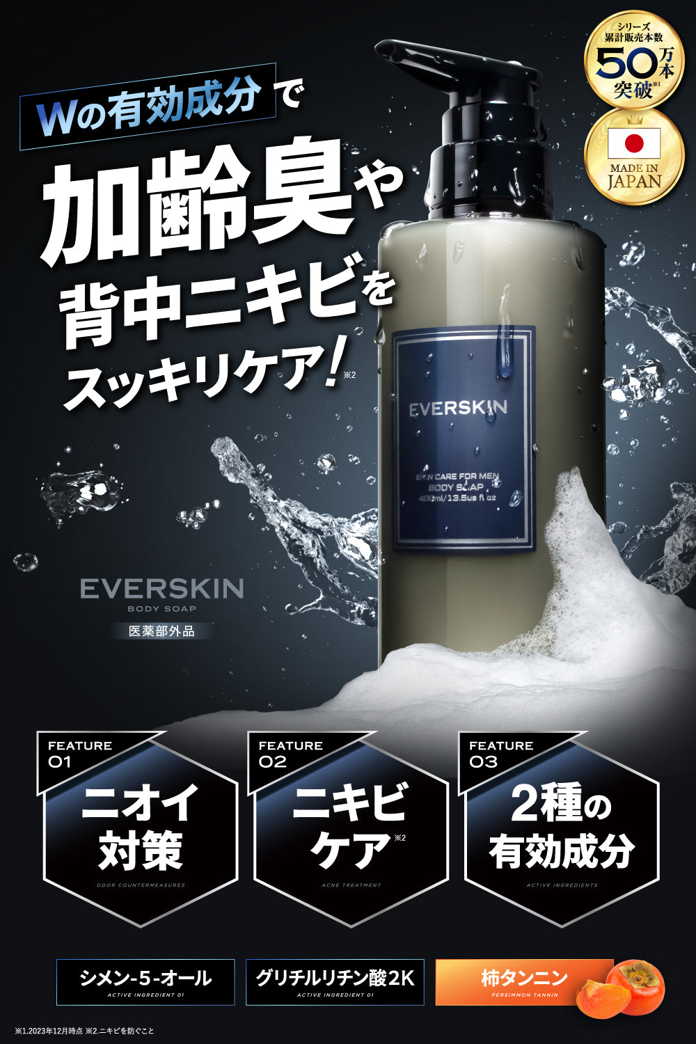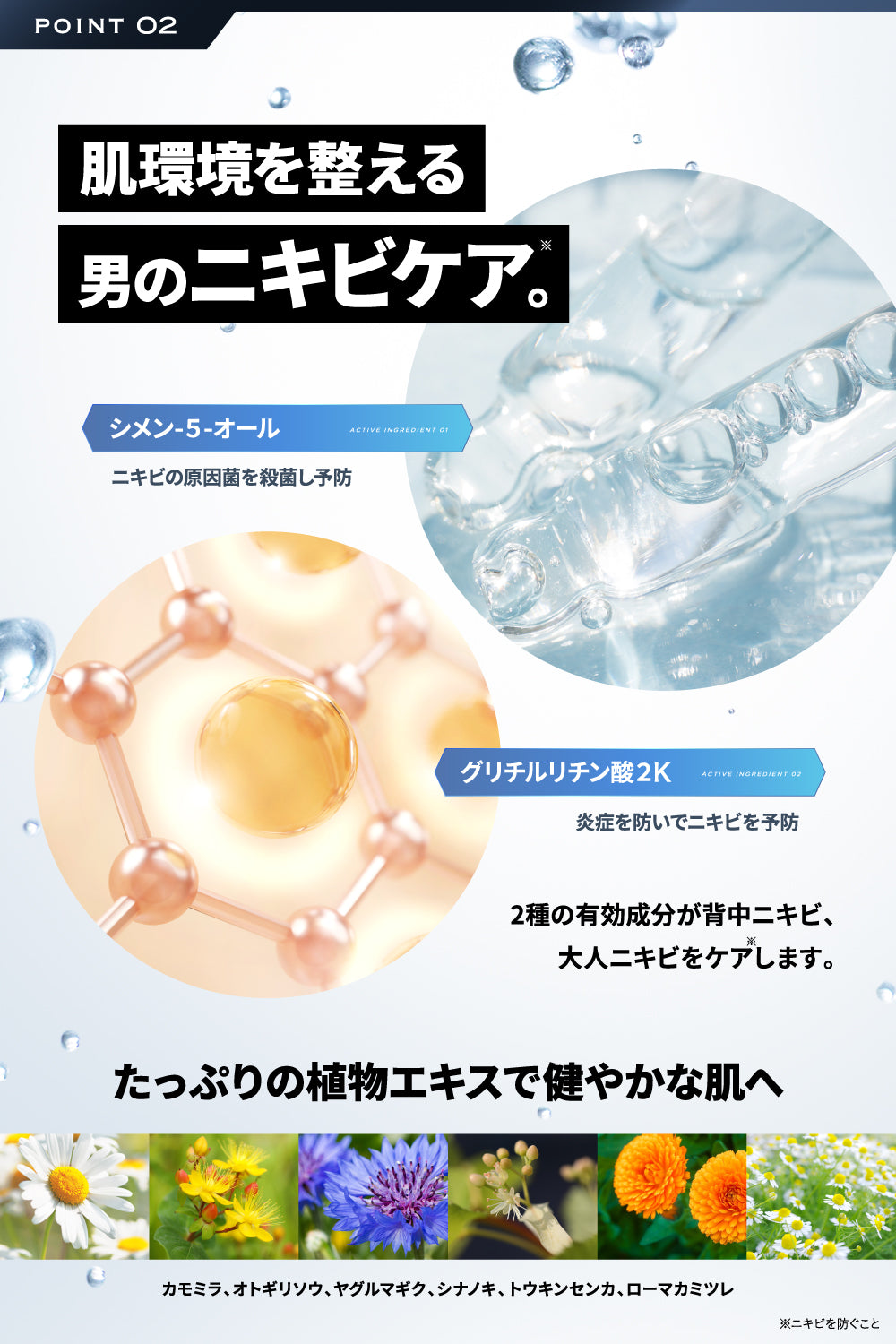 2種の有効成分を配合した医薬部外品のボディーソープが登場。肌を清潔に保ち、ニキビを防ぎます。