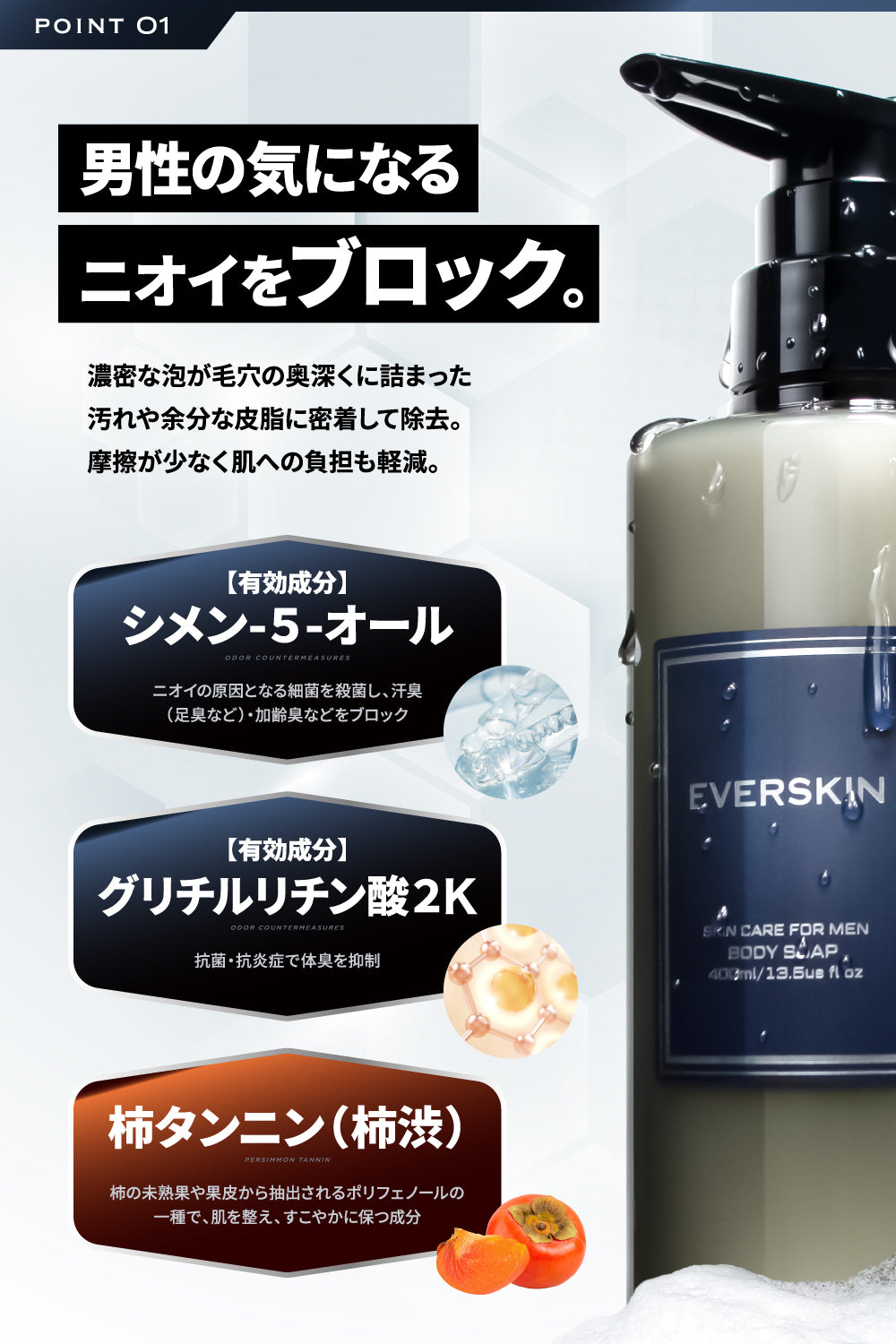 肌を清潔に保ち、ニオイやニキビを防ぎます。汗臭・体臭を防ぐ医薬部外品のボディーソープ。