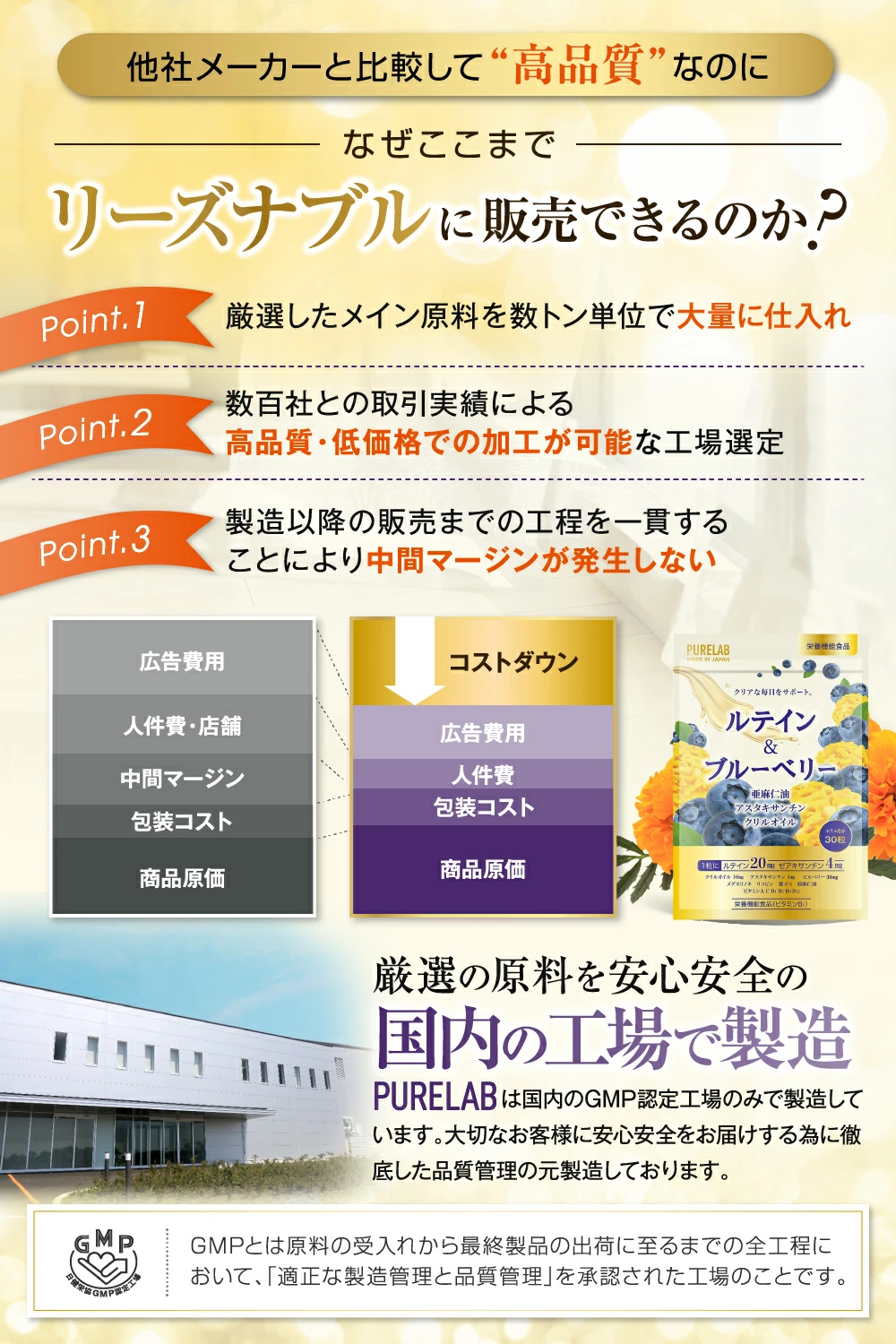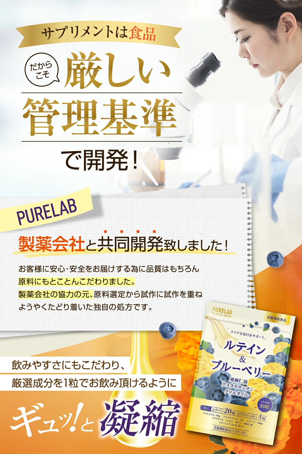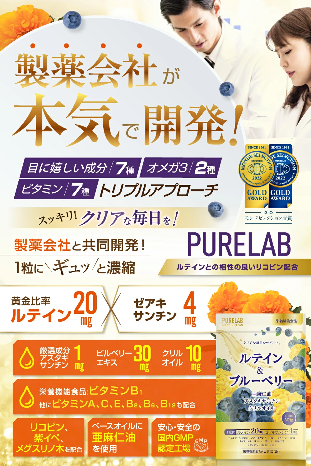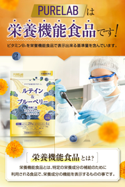 PURELAB ルテイン&ブルーベリーはビタミンB1での栄養機能食品です。ビタミンB1を栄養機能食品で表示出来る基準量を含んでいます。 ビタミンB1 以外にも ビタミンA ビタミンC ビタミンE ビタミンB2 ビタミンB6 ビタミンB12 と多数配合。上記成分の他にも男性にも女性にも人気の紫イペ、メグスリノキも配合しております。