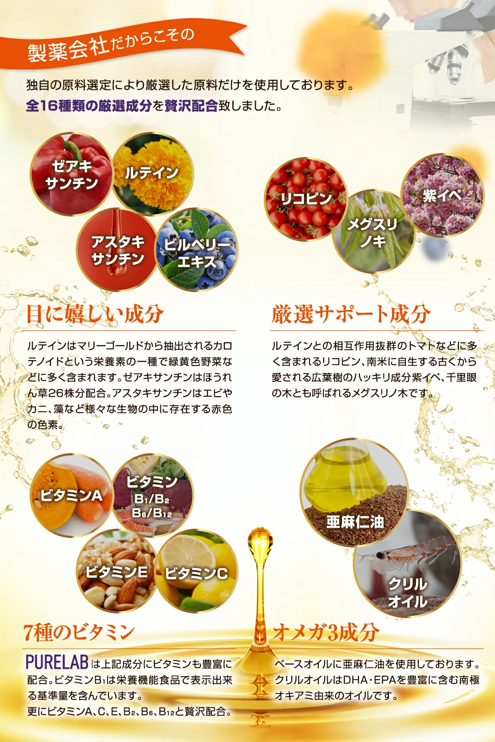 亜麻仁油、還元水飴、紫イペ末、ビルベリーエキス末、クリルオイル(オキアミ抽出物)、ビタミン E 含有植物油、メグスリノキエキス末 / ゼラチン、 マリーゴールド色素、グリセリン、ヘマトコッカス藻色素、ミツロウ、グリセリン脂肪酸エステル、ビタミンB1、カラメル色素、植物レシチン(大豆由来)、ビタミンC、ビタミンB2、ビタミンB6、トマト色素、ビタミンA、ビタミンB12