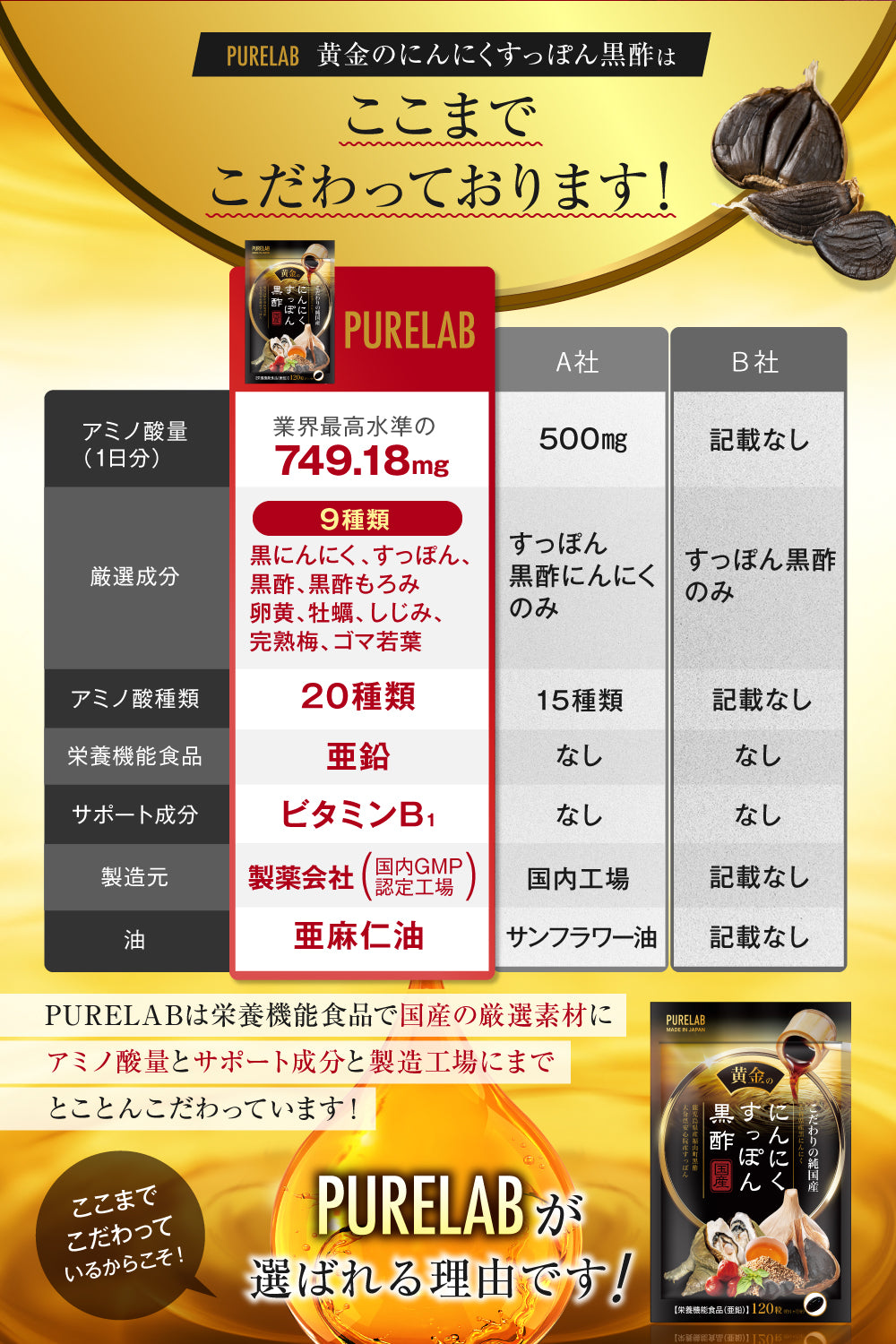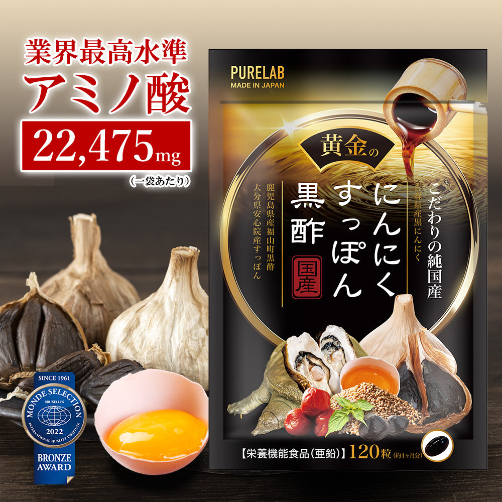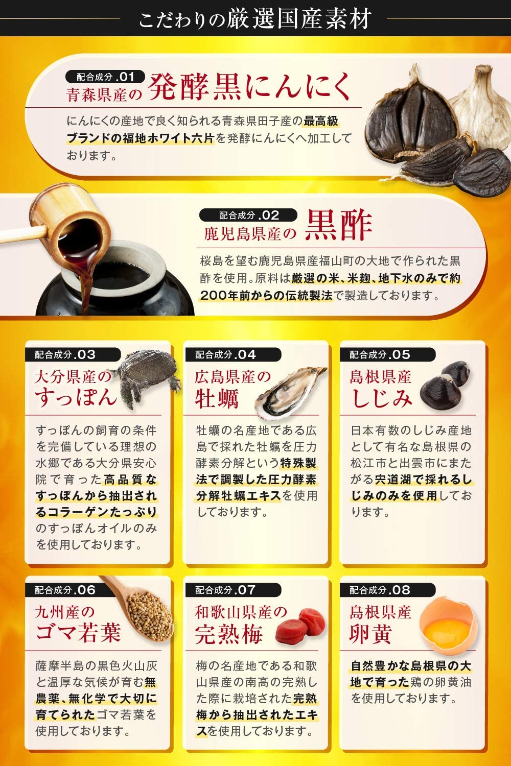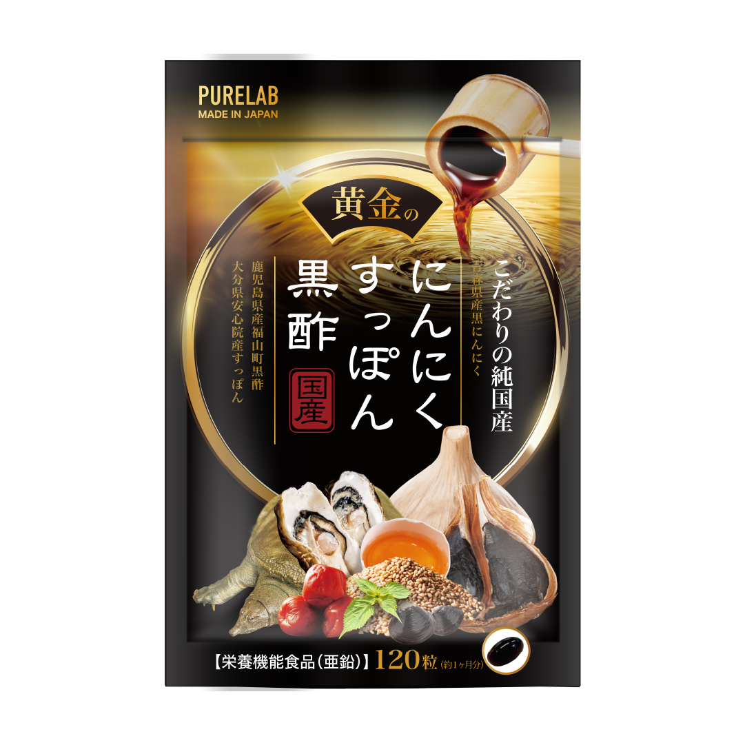 亜麻仁油(国内製造)、コラーゲンペプチド、黒酢もろみ末、胡麻若葉末、亜鉛含有酵母、黒ニンニク末、卵黄油、しじみエキス末、牡蠣エキス末、スッポン末、梅エキス末、黒酢粉末、アサイー凍結乾燥粉末、プロポリスエキス末/ゼラチン、グリセリン、ミツロウ、グリセリン脂肪酸エステル、カラメル色素、ビタミンB1、植物レシチン(大豆由来)、ビタミンA