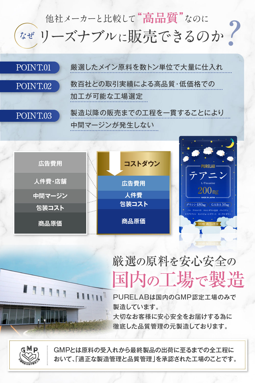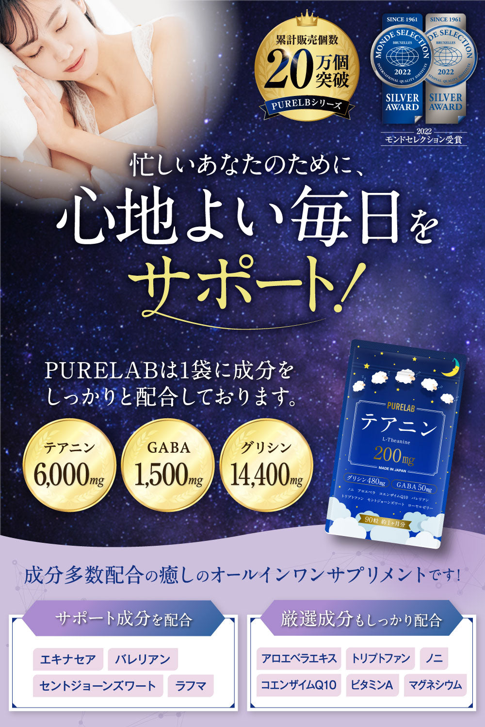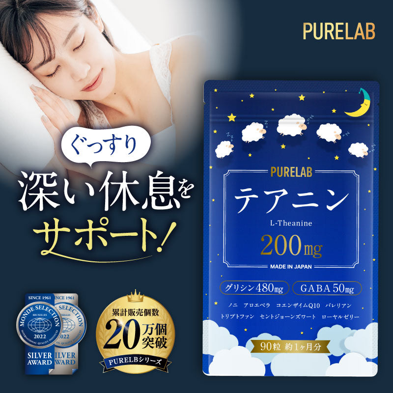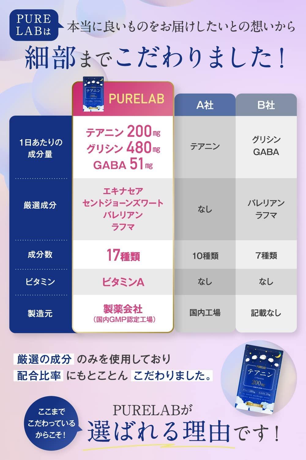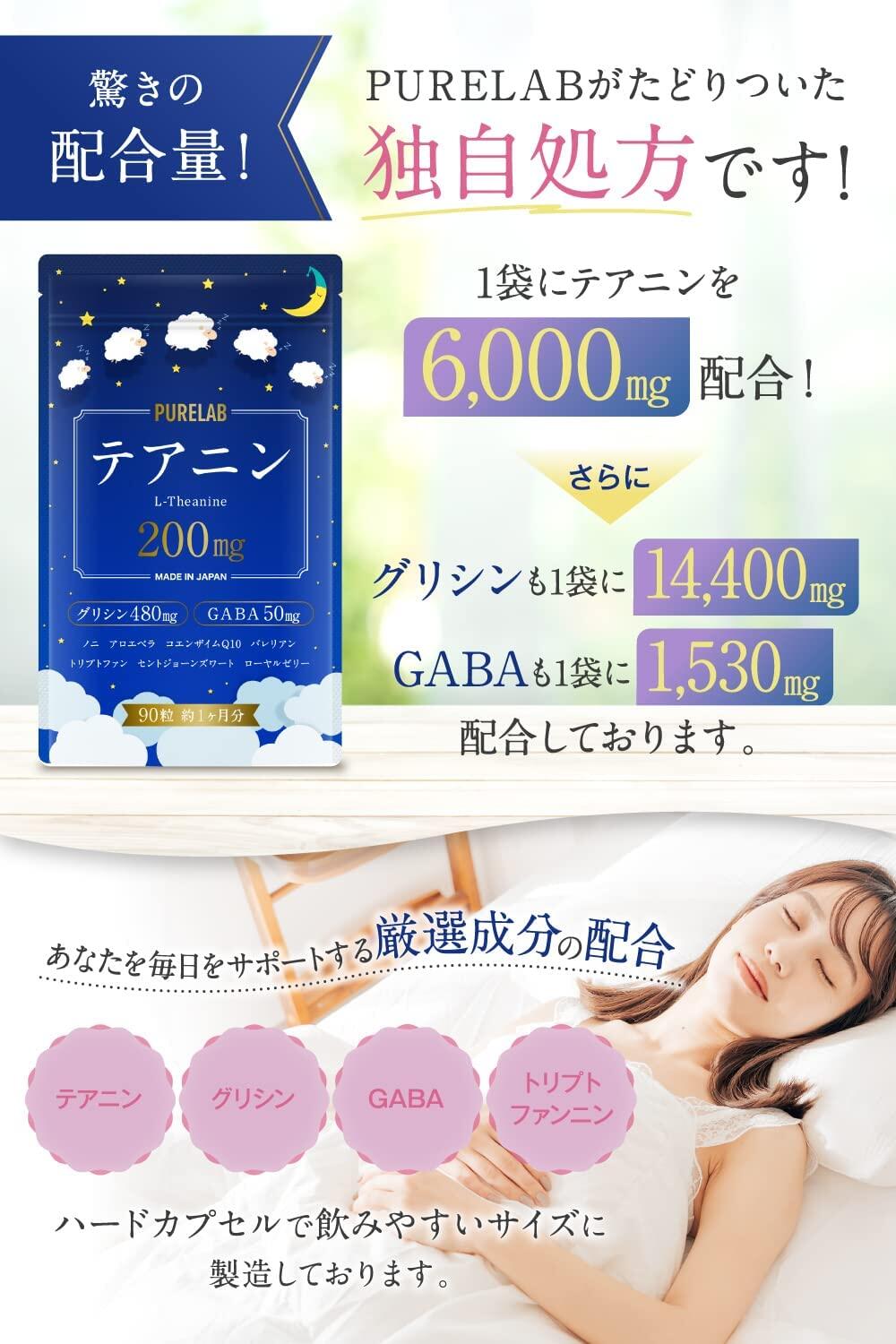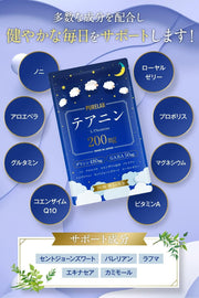 グリシン、L-テアニン、GABA(γ-アミノ酪酸)、アロエベラエキス、セイヨウオトギリソウ抽出物、L-トリプトファン、ラフマエキス末、バレリアンエキス、カミツレエキス末、L-グルタミン酸、コエンザイムQ10、エキナセアエキス、プロポリス末、ローヤルゼリー、ビタミンA、マグネシウム、ノニ粉末