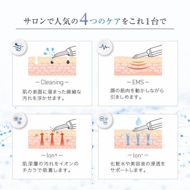 サロンで人気の機能を4つ搭載し、自宅にいながら極上のスキンケアを体験していただけます。水と超音波の振動により毛穴の汚れや古い角質を除去するため肌の負担を最小限にし、優しくケアすることができます。毛穴汚れを取り除くだけでなく、化粧水や美容液の浸透をサポートしツヤのある美肌へ導きます。自動電源オフ機能を備えており、各モードの動作開始時から5分後に電源が自動でオフになります。