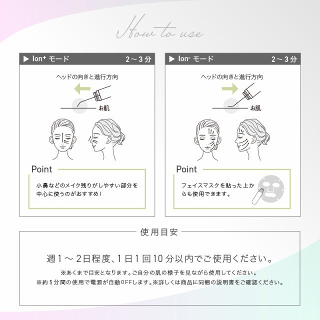 Ion+はクレンジングや洗顔では落としきれないメイク残りや皮脂汚れを浮かせます。鼻や顎など毛穴の汚れが気になる部位に使用すると効果的です。Ion-は化粧水や美容液の浸透をサポートします。フェイスマスクをしながら使用すると更に浸透力がアップし効果的なケアができます。